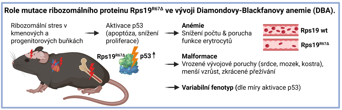 Pomocí tohoto nového modelu tým odhalil, proč přesně červené krvinky mizí. Zjistili, že když jsou buněčné továrny na bílkoviny (ribozomy) ve stresu, „strážní“ protein zvaný p53 zpanikaří a zatáhne za buněčnou záchrannou brzdu. Vědci zjistili, že k tomu dochází mnohem dříve, než se dosud myslelo – postiženy jsou kmenové buňky („prarodiče“) v kostní dřeni ještě předtím, než mají vůbec šanci dozrát do červených krvinek. Propojení obou týmů využívá expertíz špičkové myší molekulární genetiky a buněčné hematologie. Vytvářejí synergii, která byla podporována i granty z Grantové agentury ČR, Národního projektu obnovy a dalšími programy MŠMT.