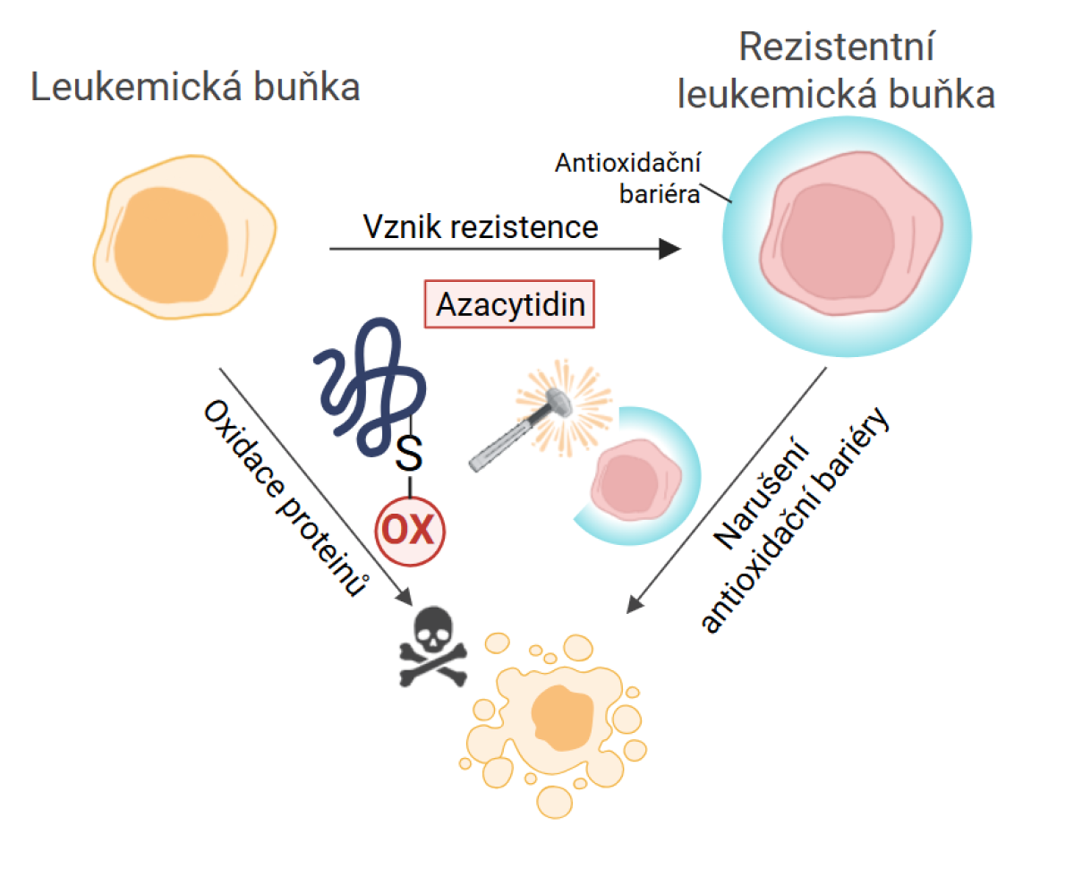Vědci z 1. lékařské fakulty Univerzity Karlovy a Všeobecné fakultní nemocnice v Praze odhalili, proč lék na akutní myeloidní leukémii azacytidin postupně u pacientů přestane fungovat. Jejich studie ukazuje, že azacytidin zabíjí leukemické buňky oxidací bílkovin, zatímco rezistence na tento lék vzniká posílením antioxidačních mechanismů. Vědecká studie byla publikována v časopise Redox Biology na konci roku 2025 a vědci si slibují, že může pomoci zlepšit strategie léčby u smrtelné formy leukémie.