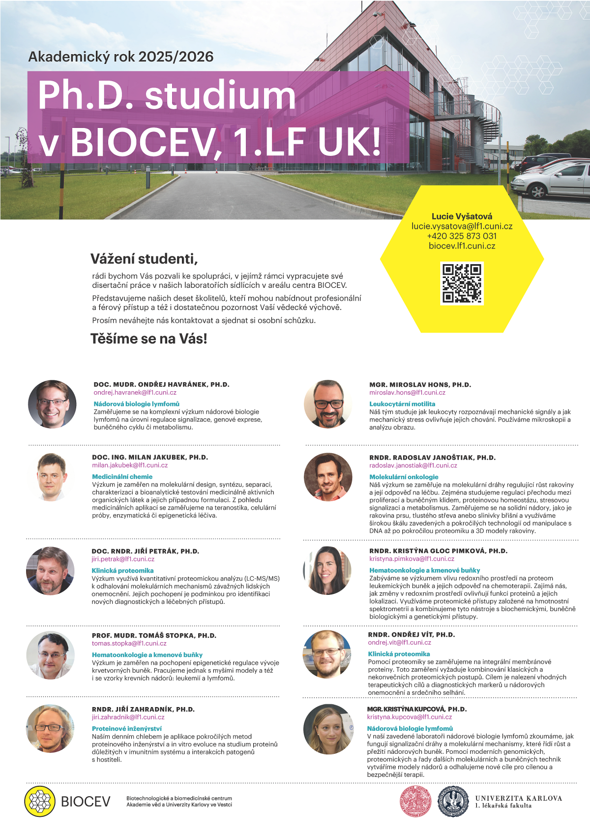 Představujeme školitele, vedoucí laboratorních skupin 1. lékařské fakulty Univerzity Karlovy v BIOCEV, kteří mohou nabídnout profesionální a férový přístup a též i dostatečnou pozornost Vaší vědecké výchově.
